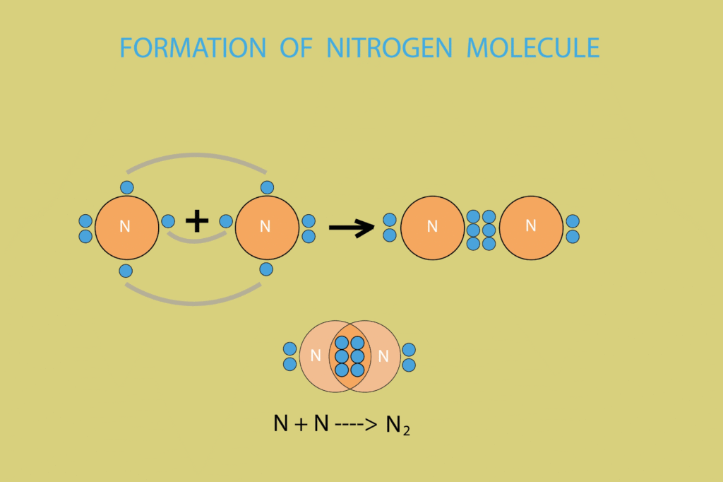 A nitrogen atom, with an electron configuration of 2, 5, requires three more electrons to complete its valence shell. To accomplish this, two nitrogen atoms share three pairs of electrons between them, resulting in a very strong triple bond in a nitrogen molecule (N₂). This triple covalent bond involves a total of six electrons. Since each atom uses only three of its five valence electrons for bonding, two non-bonding electrons remain on each atom, forming what is known as a lone pair.
