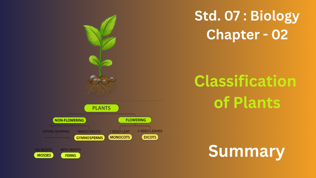 Key concepts include the classification hierarchy, distinguishing features of each group (vascular tissue presence, reproduction method, seed characteristics), and basic differences between monocots and dicots, illustrated with common examples.