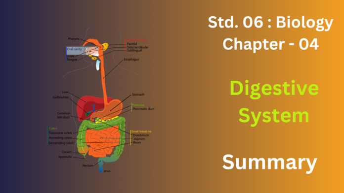 The chapter also likely talks about important helpers called digestive glands: salivary glands (for saliva), the liver (producing bile for fats), and the pancreas (making juices for carbs, fats, and proteins in the small intestine).