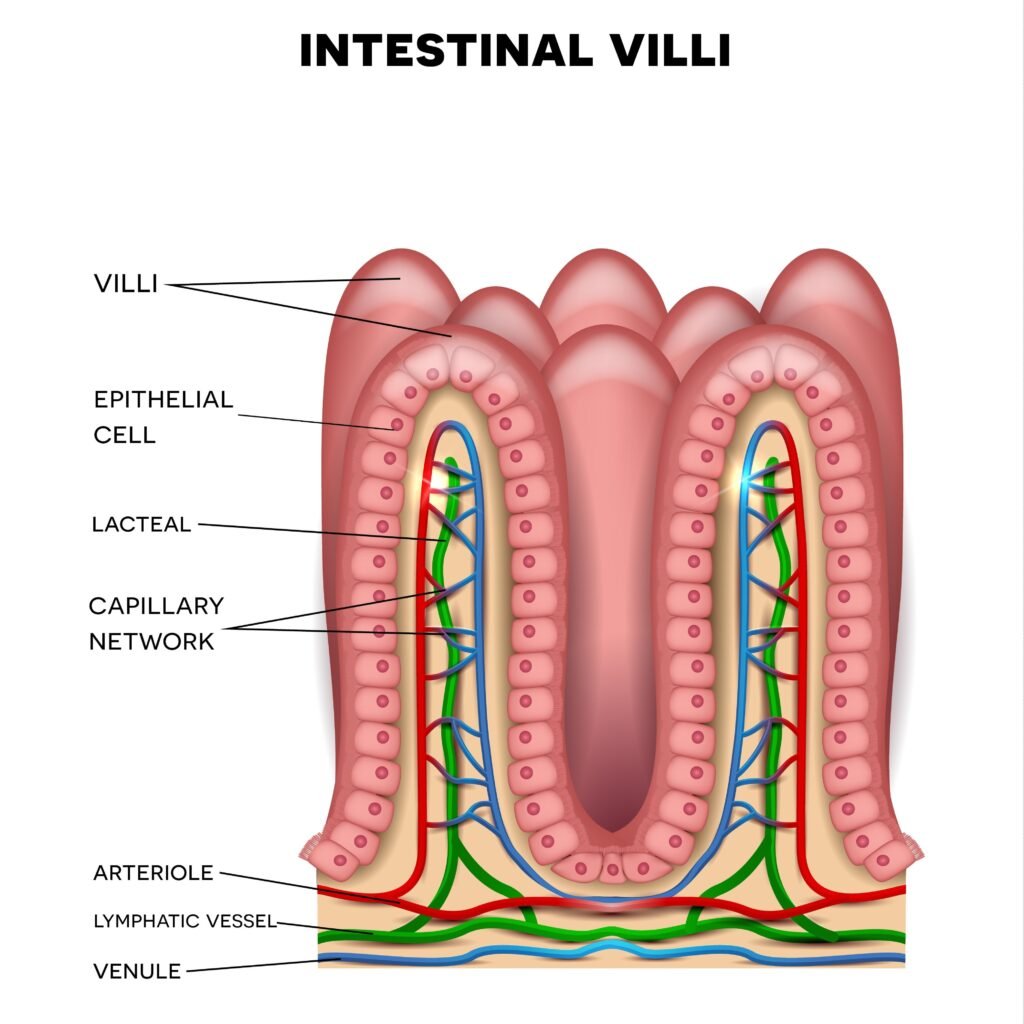 • Fat-soluble vitamins (A, D, E, K) are absorbed along with digested dietary fats. They are incorporated into micelles (small fat droplets) and transported across the intestinal lining into the lymphatic system.