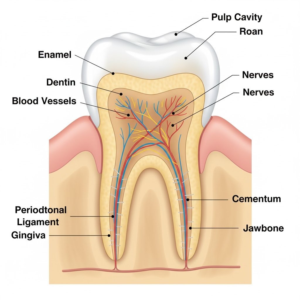 • Pulp Cavity: The central chamber of the tooth containing pulp.