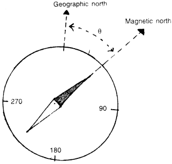 What is declination ? Draw a diagram to show the angle between the declination and true direction of geographic north.
