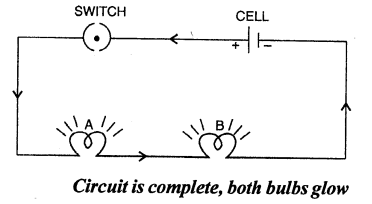 Take two torch bulbs A and B. Connect them to a cell through a switch as shown in fig. The bulbs are said to be in series. Close the switch (i.e., the circuit it completed), you will see that both the bulbs glow.