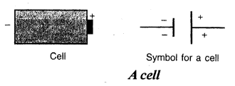 2. Cell – A cell or a group of cells is generally used as a source of electricity. A positive (+) and a negative (-). It is represented by the two vertical lines of unequal lengths. The long vertical line represents the positive terminal and the short line represents the negative terminal as shown in fig.