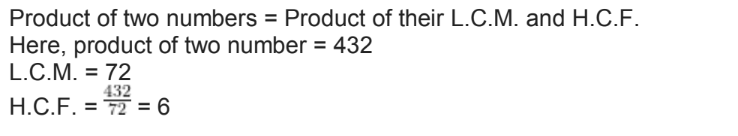 The product of two numbers is 432 and their L.C.M. is 72. Find their H.C.F.