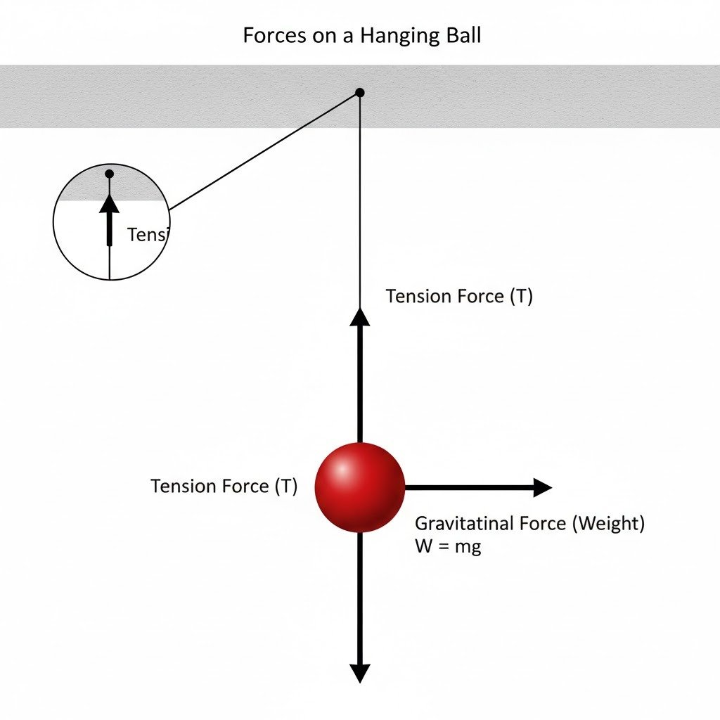 - Tension Force (T): Acts upwards along the string, exerted by the string on the ball.