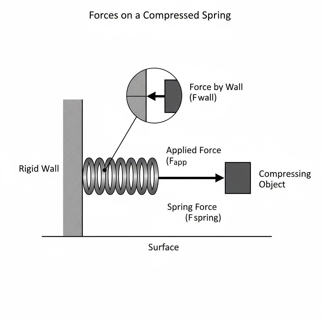 - Spring Force (F_spring): The internal restorative force of the spring itself, acting to return it to its original length. When compressed, this force acts outwards from both ends.
