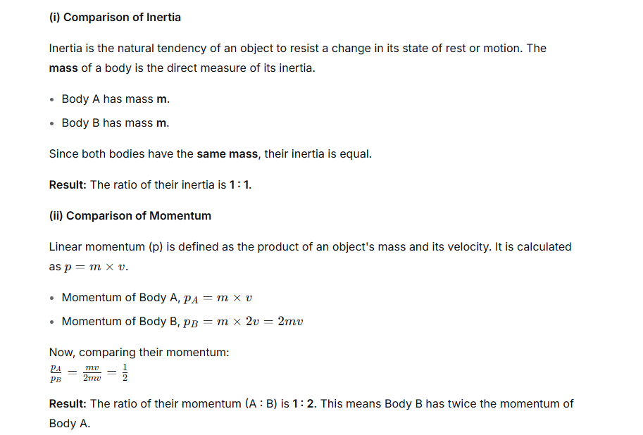 Two bodies A and B of same mass are moving with velocities v and 2v, respectively. Compare their (i) inertia and (ii) momentum.