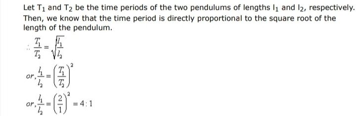 The time periods of two simple pendulums at a place are in the ratio 2:1. What will be the corresponding ratio of their lengths?