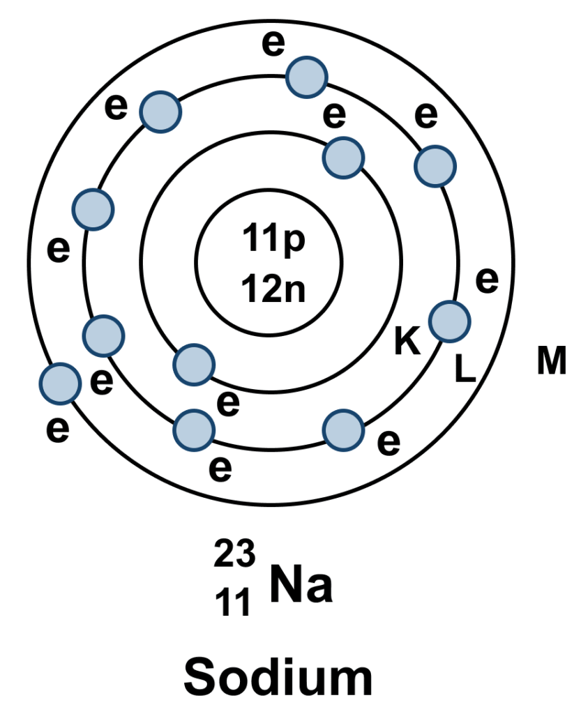 A simple sketch would show a central nucleus labeled with 11 protons and 12 neutrons, surrounded by three circles. The inner circle has 2 dots, the middle has 8, and the outer circle has 1 dot representing the electrons.