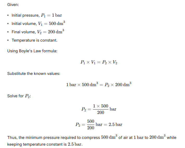 This problem is solved using Boyle’s Law, which states that for a fixed mass of gas at constant temperature, the pressure and volume are inversely proportional. This means the product of the initial pressure and volume will equal the product of the final pressure and volume.
