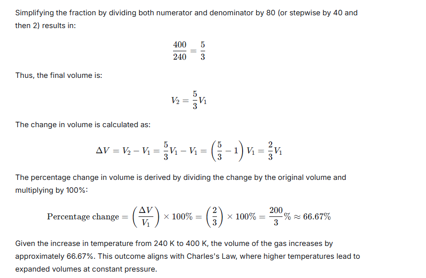 Simplifying the fraction 819/546 by dividing both numerator and denominator by 273 gives V₂ = (3 / 2) V₁. Therefore, the final volume of gas ‘X’ is 1.5 times its original volume. In essence, the tripling of the temperature increases the volume, while the doubling of the pressure decreases it; the net effect is a 50% increase from the starting volume.