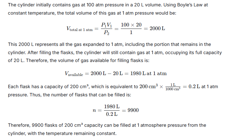A cylinder of 20 liters capacity contains gas at 100 atmospheric pressure. How many flasks of 200 cm3capacity can be filled from it at 1-atmosphere pressure, temperature remaining constant?