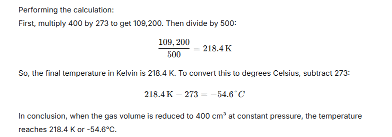 Your calculation shows this perfectly: Starting at 300 K, a quarter gives 75 K. Converting that to Celsius by subtracting 273 yields the final result of –198 °C. So, your final answer is accurate. The gas cools dramatically because the drop in pressure has a stronger combined effect than the reduction in volume.