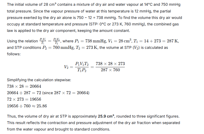 Calculate the volume of dry air at STP that occupies 28 cm3 at 14°C and 750 mmHg pressure when saturated with water vapour. The vapour pressure of water at 14°C is 12 mmHg.