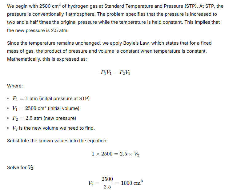 2500 cm3 of hydrogen is taken at STP. The pressure of this gas is further increased by two and a half times (temperature remaining constant). What volume will hydrogen occupy now
