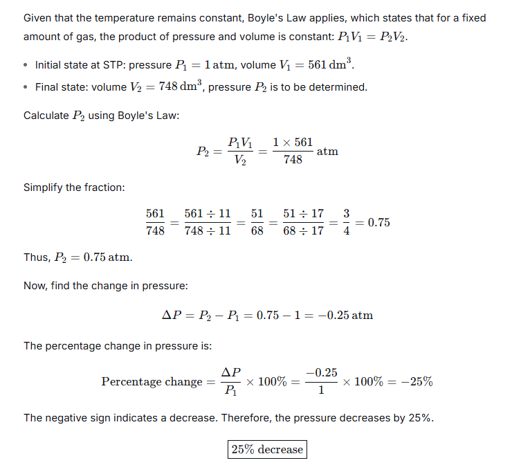 561 dm3 of a gas at STP is filled in a 748 dm3 container. If the temperature is constant, calculate the percentage change in pressure required.