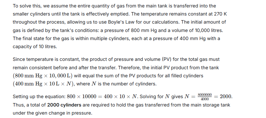A gas is to be filled from a tank of capacity 10,000 litres into cylinders each having capacity of 10 litres. The condition of the gas in the tank is as follows: