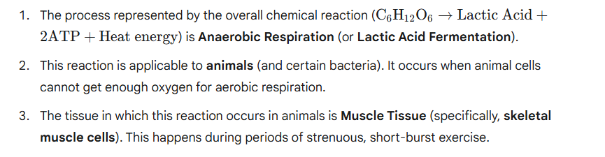 2. Given below is an overall chemical reaction of a certain process: C6H12O6→LacticAcid+2ATP+Heat energy Is this reaction applicable to animals or to plants or to both animals and plants?
