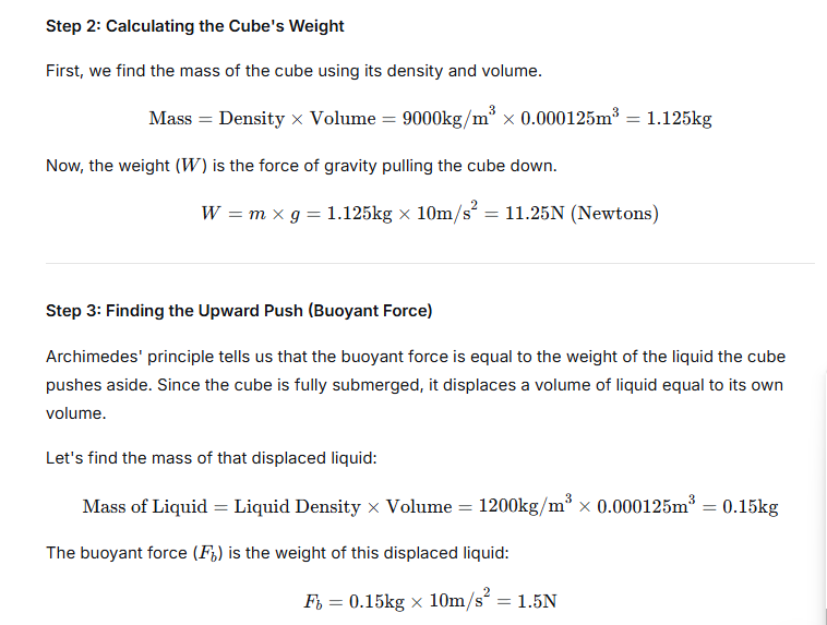 - The Force from Below is Stronger: Imagine a cube submerged in water. The water pushes against every face of the cube. The force pushing down on the top of the cube is less than the force pushing up on the bottom of the cube because the bottom is at a greater depth and experiences higher pressure.