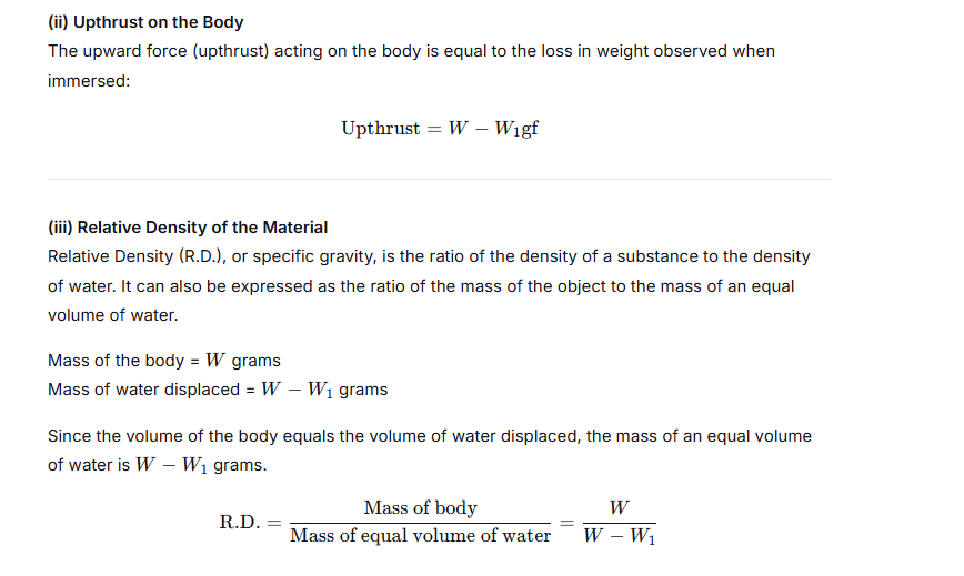 - The spring balance reading in air (W₁) is greater than the reading when the object is submerged in water (W₂).