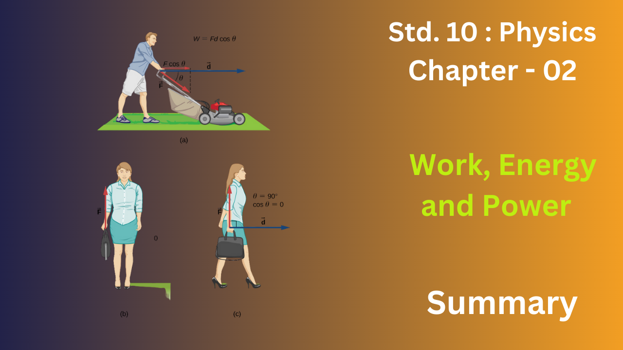 The chapter fundamentally explores the concepts of work, energy, and power, and the intrinsic relationship between them. In physics, work is said to be done only when a force applied on an object causes it to displace in the direction of the force. Its calculation is given by the formula W = F × s × cosθ, where the angle θ is crucial. For instance, no work is done if the force is perpendicular to the displacement. Energy is the capacity to do work, and it exists in various forms, with kinetic energy (energy of motion, KE = ½mv²) and potential energy (stored energy due to position, PE = mgh) being the primary focuses. A key principle is the Law of Conservation of Energy, which states that energy cannot be created or destroyed, only transformed from one form to another. Finally, power is the rate at which work is done or energy is transferred, calculated as P = W/t. It measures how quickly a task is accomplished, distinguishing it from the total amount of work or energy itself. These three concepts are deeply interconnected, as energy is transferred through the doing of work, and power quantifies the speed of this energy transfer.
